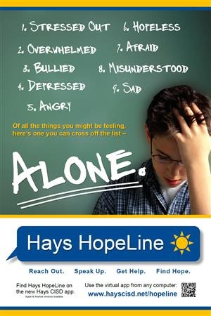 Bullying is not tolerated in Hays CISD. Report bullying using the Hays HopeLine feature on this page. To learn more about bullying, visit the Hays CISD Bullying page.